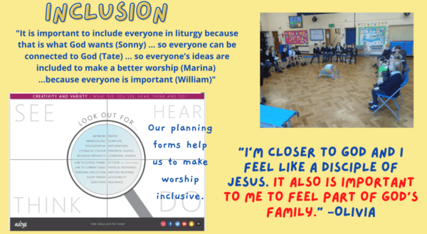 Pupils and staff use diocesan planning and evaluation templates to ensure high quality worship is offered at all times. Classes evaluate and feedback upon each other’s liturgies and personal impact statements are gathered, in addition to regular monitoring and evaluation by the leadership team. To ensure rigour in providing purposeful opportunities for our spiritual growth, targets are set each year, which incorporate pupil, staff and parent voice:
