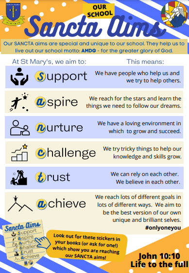 Our vision, mission and SANCTA values are displayed around school. We refer to these during learning, assemblies and through collective worship opportunities and forms the cornerstone of our Behaviour Policy and our Behaviour Currciulum – ‘The St Mary’s Way’. We regularly carry out specific work and activities to help keep us focused on our faith and educational journey together.